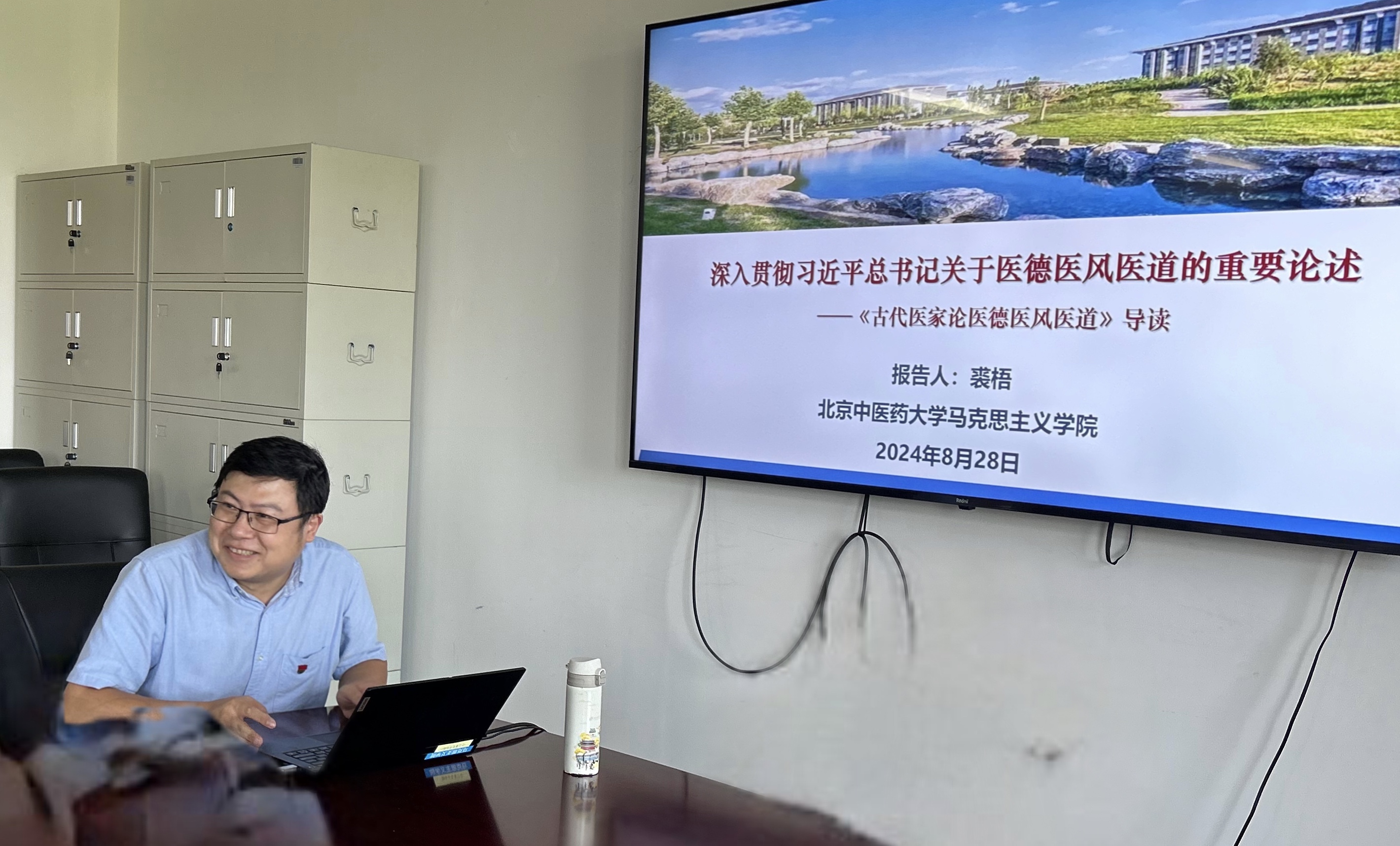 裘梧副院长以《学习贯彻习近平总书记关于医德医风医道的重要论述》为题讲授专题党课,深入解读习近平总书记“广大医务工作者要恪守医德医风医道”的重要指示精神,系统梳理了新时代医德医风医道建设的思想基础和理论进路,同时以《古代医家论医德医风医道》读本的编写过程为例,提出应在习近平新时代中国特色社会主义思想指导下不断挖掘利用中医药典籍中蕴藏的医德医风医道思想资源,实现创造性转化和创新性发展。
