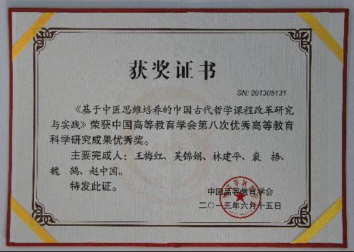 作为该项目的前期基础,由王梅红老师牵头的中国古代哲学教学研究成果获得了2012年度太阳集团tyc9728教育教学成果奖一等奖。成果相关的研究论文发表于《中医教育》2012年第6期,并获得中华医学会医学教育分会医学教育优秀论文评选一等奖。团队成员的论文《试论中国哲学教育在中医大学生素质培养中的作用》被评为全国中医药高教学会教学管理研究会、教育科学研究会2013年学术年会优秀论文。