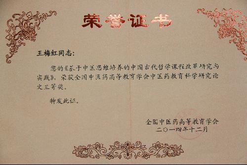 《基于中医思维培养的中国古代哲学课程改革研究与实践》荣获全国中医药高等教育学会中医药教育科学研究论文三等奖
