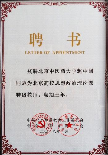 根据市委、市政府《关于全面加强北京高校马克思主义理论学习研究宣传的实施意见》(京办字﹝2015﹞9号)的有关部署,北京市委教工委于2017年6月启动第二批北京高校思想政治理论课特级教授、特级教师申报和评审工作。经资格审核、专家评审、工委会审议,确定评聘名单。我院赵中国老师获得第二批北京高校思想政治理论课特级教师称号。