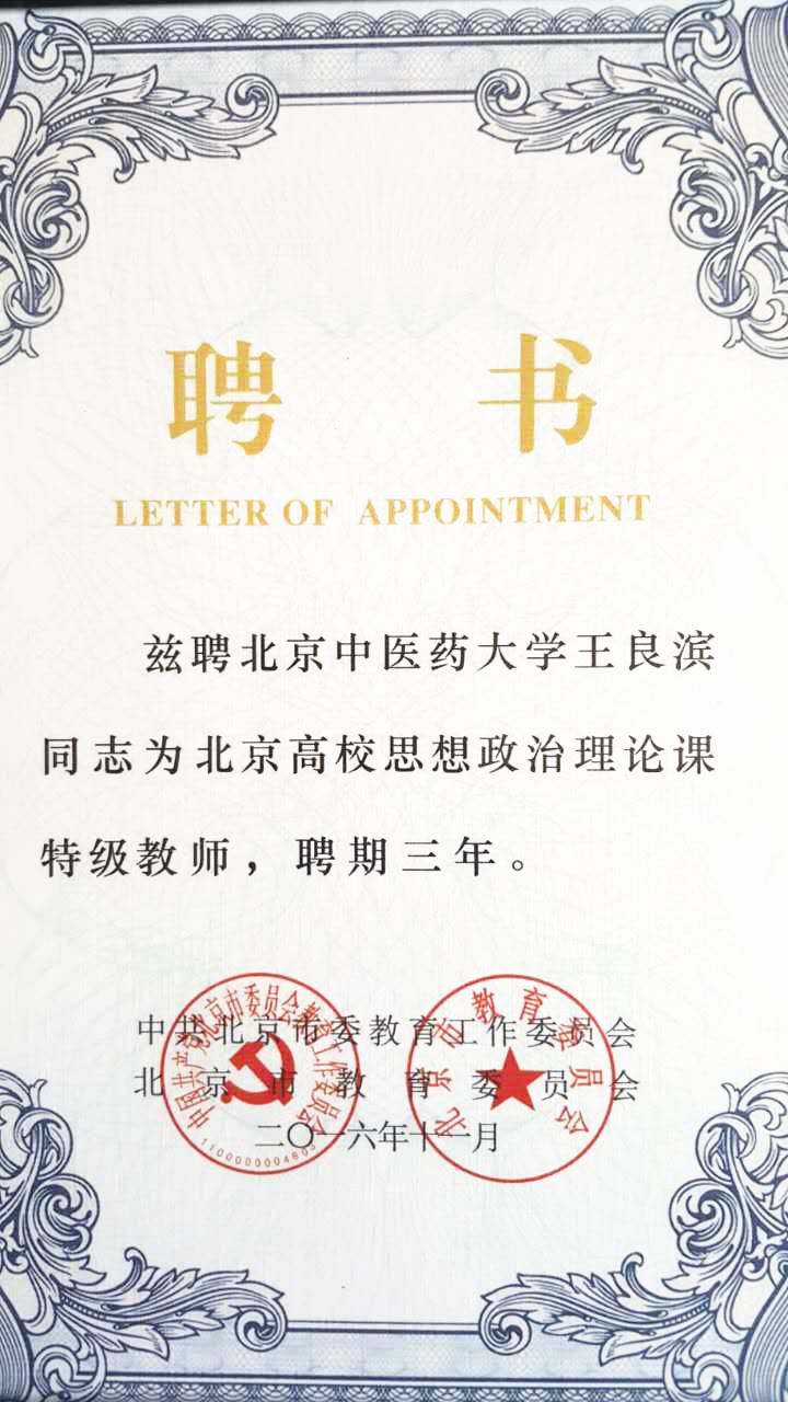 按照市委、市政府《关于全面加强北京高校马克思主义理论学习研究宣传的实施意见》(京办字〔2015〕9号)部署,依据《北京高校思想政治理论课特级教授、特级教师评聘管理办法(试行)》(京教工〔2016〕10号)、《关于评聘首批北京高校思想政治理论课特级教授、特级教师的通知》(京教工办〔2016〕12号)要求,北京市委教育工委开展了首批北京高校思想政治理论课特级教授、特级教师评聘工作。我院王良滨老师荣获首批北京高校思想政治理论课特级教师称号。