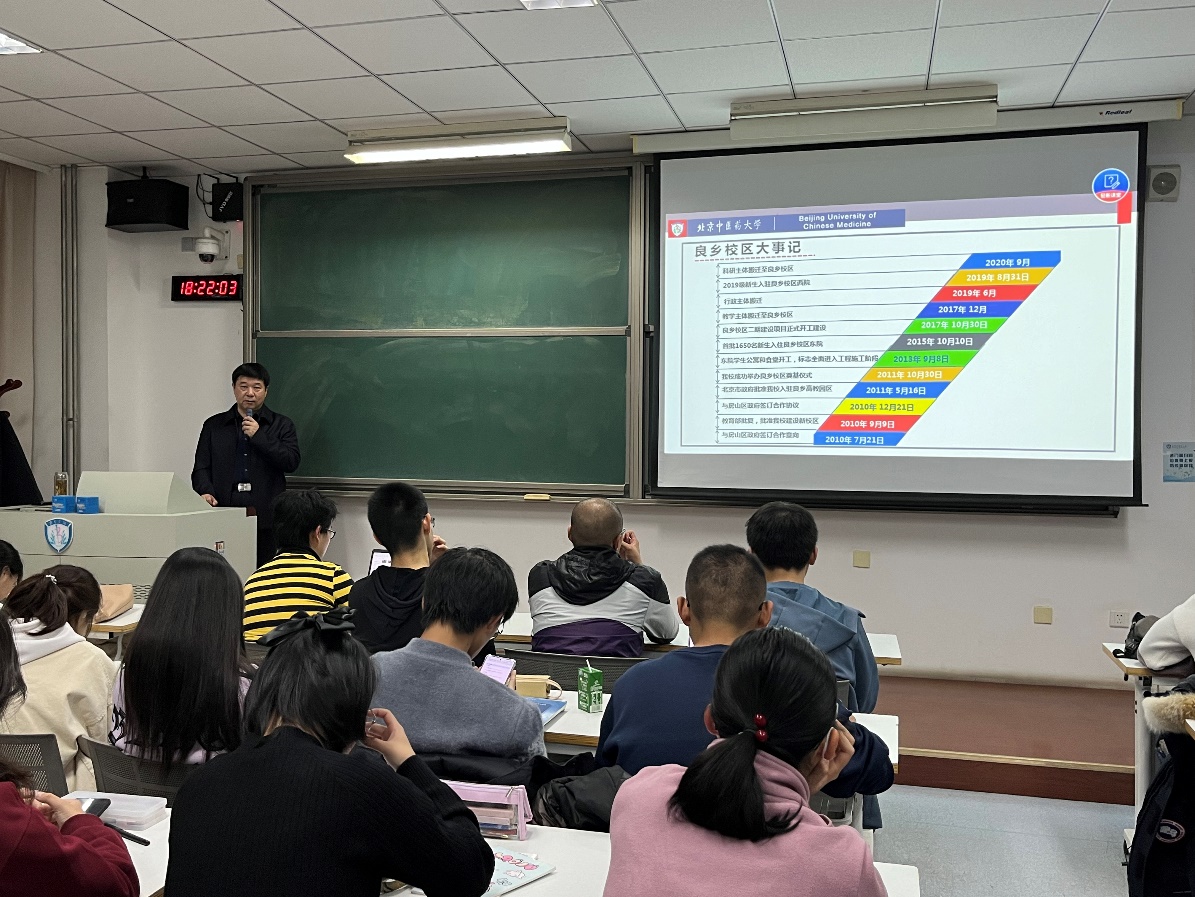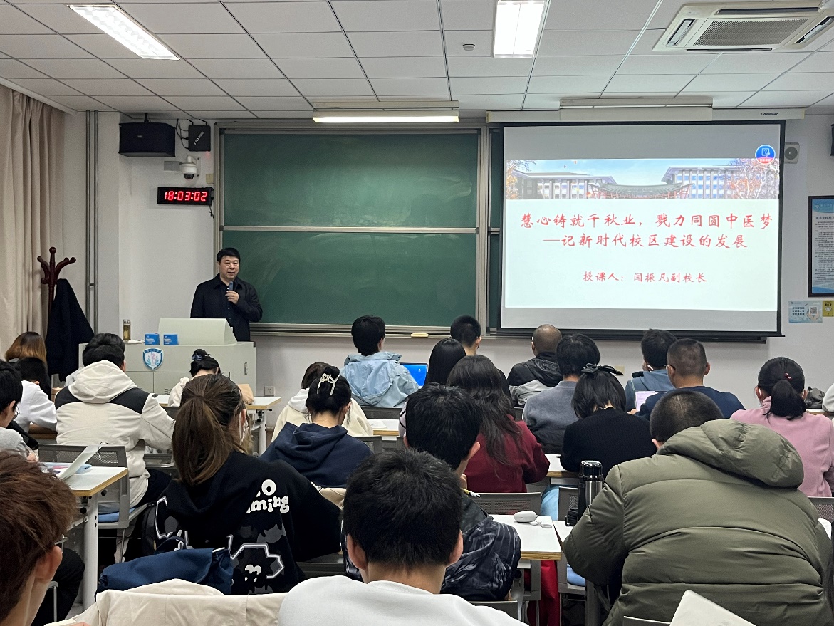 2023年11月22日,太阳集团tyc9728副校长闫振凡走进《校史文化与北中医精神》课堂,以《慧心铸就千秋业,戮力同圆中医梦——记新时代校区建设的发展》为题,给同学们分享了新时代以来北中医校区规划建设情况。