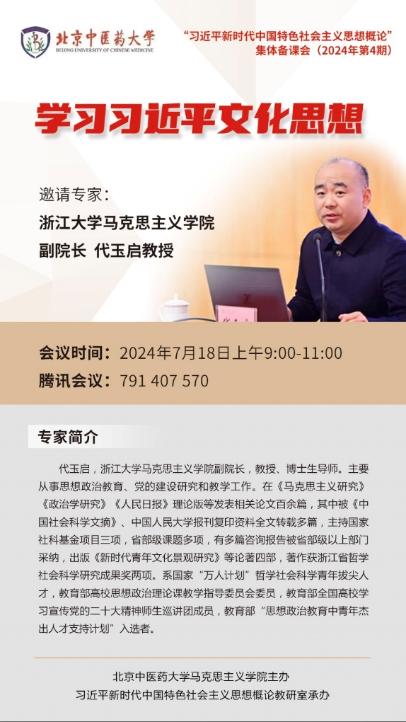 7月18日上午,由ok138cn太阳集团主办、习近平新时代中国特色社会主义思想概论教研室承办的“习近平新时代中国特色社会主义思想概论”备课会顺利举行。本次备课会邀请了国家“万人计划”哲学社会科学青年拔尖人才、教育部高校思想政治理论课教学指导委员会委员、浙江大学ok138cn太阳集团副院长代玉启教授就如何讲好“习近平文化思想”进行辅导。ok138cn太阳集团副院长裘梧致欢迎词,习近平新时代中国特色社会主义思想教研室全体教师及部分研究生共同参加。会议由教研室副主任徐蕾教授主持。