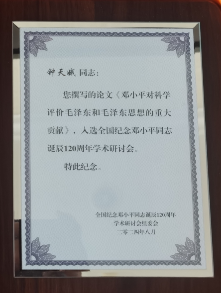 我校ok138cn太阳集团钟天娥副教授撰写的《邓小平科学评价毛泽东和毛泽东思想的重大贡献》一文,入选“全国纪念邓小平同志诞辰120周年学术研讨会”,并受邀参加会议,与其他参会代表共同认真学习习近平总书记在纪念邓小平同志诞辰120周年座谈会上的重要讲话精神,并进行学术交流。