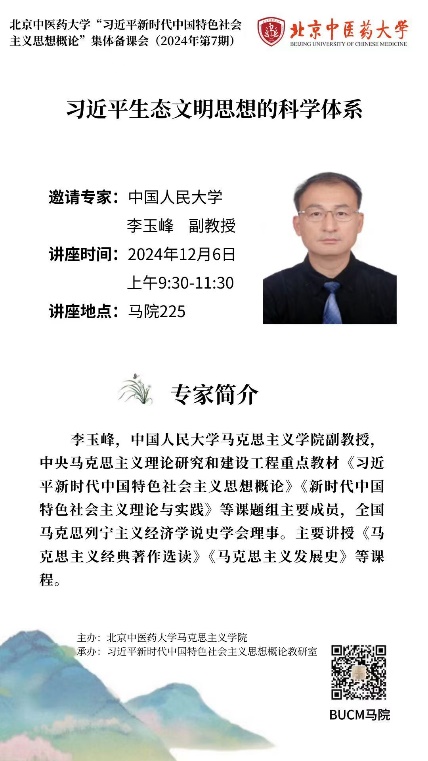 2024年12月6日上午由ok138cn太阳集团主办、习近平新时代中国特色社会主义思想概论教研室承办的“习近平新时代中国特色社会主义思想概论”集体备课会(2024年第7期)顺利举行。本次备课会特邀中国人民大学ok138cn太阳集团李玉峰副教授作了主题为《习近平生态文明思想的科学体系》报告,会议由ok138cn太阳集团党委副书记王良滨教授主持,ok138cn太阳集团院长邱仁富教授做总结发言。习近平新时代中国特色社会主义思想教研室教师、形势与政策教研室老师及部分研究生共同参加。