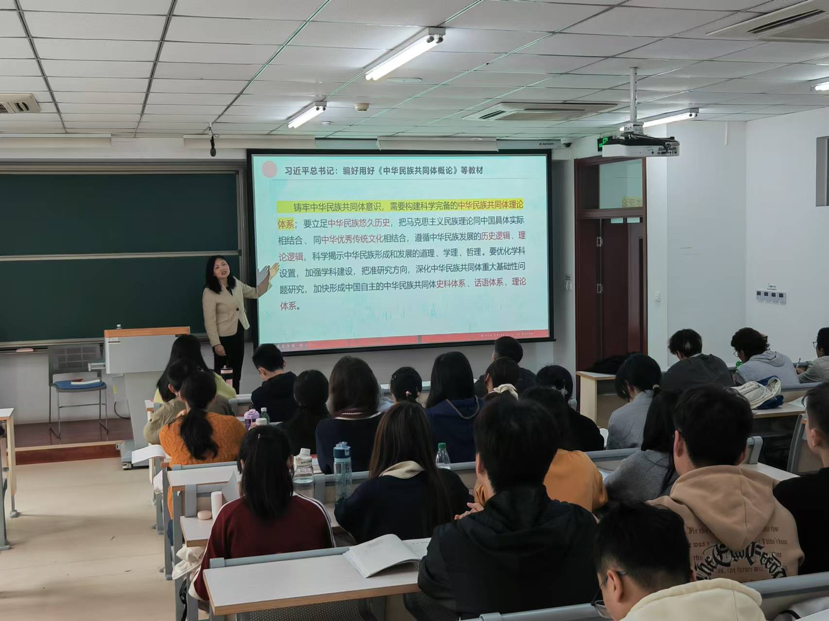 在授课中,王云芳教授结合深入研究和实践调研,向同学们讲述了筑牢中华民族共同体意识的实际案例,生动地展现了五十六个民族像石榴籽一样紧紧抱在一起,团结一心,创造美好生活,为实现中华民族伟大复兴而不断奋斗。她鼓励同学们好好学习课程知识,努力成为新时代铸牢中华民族共同体意识的践行者和守护者。
