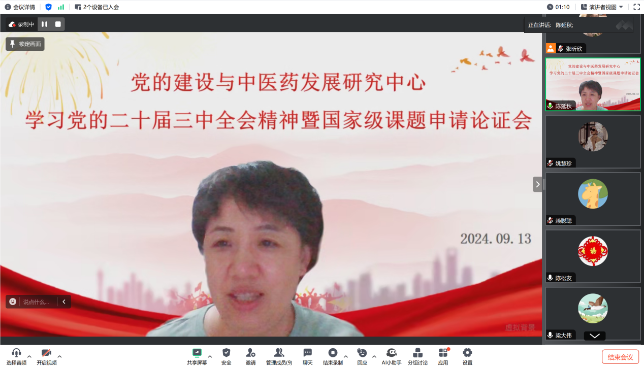 为深入学习贯彻党的二十届三中全会精神,推动中医药事业的传承创新发展,党的建设与中医药发展研究中心于2024年9月13日成功举办以“学习党的二十届三中全会精神”为主题的线上讨论会。会议由研究中心负责人陈延秋副教授主持,特邀了江南大学中共党史党建研究院执行院长、博士生导师、国家社科基金重大项目首席专家陈松友教授和大连理工大学ok138cn太阳集团博士生导师、国家哲学社会科学基金评审专家、教育部学位与研究生发展教育中心评审专家梁大伟教授作为专家嘉宾,中心全体成员共同参与研讨。