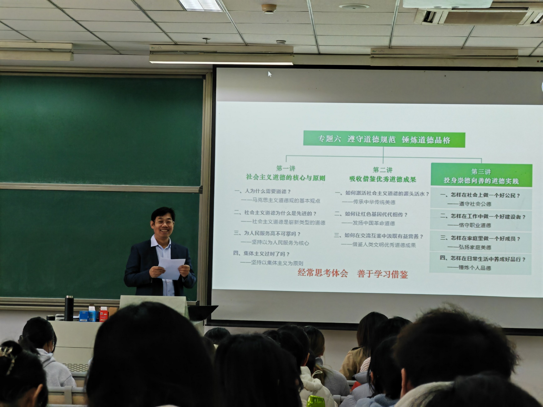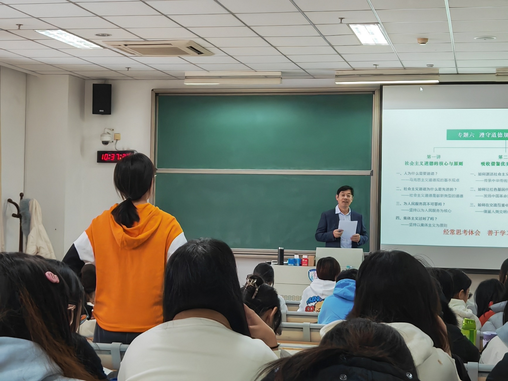 刘书记还与同学们展开积极互动,同学们围绕课程内容和大学生活的疑问和困惑踊跃提问,刘书记一一予以耐心的回应和解答。在课程的最后,刘书记鼓励同学们要踊跃投入道德实践,多向道德模范学习,参与志愿服务活动,积极引领社会风尚,涵养高尚道德品格。