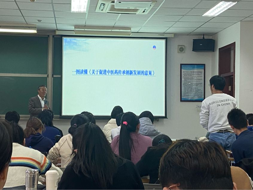 随后,陶校长详细讲述了毛泽东同志和习近平同志两代领袖对中医药事业的关怀和指导。新中国初期和新时代是中医药事业传承创新发展的关键时期。在新中国成立初期,毛泽东同志客观审视中医药的历史意义和现实价值,大力支持中医药事业的发展,提出“中西医结合”的基本原则。在新时代,习近平同志高度重视中医药事业,提出了“中医药学是中国古代科学的瑰宝,也是打开中华文明宝库的钥匙”的重要判断,做出了“切实把中医药这一祖先留给我们的宝贵财富继承好、发展好、利用好”的重要指示。陶校长结合新时代一系列关于中医药事业的政策文件和“全国中医药大会”的召开,深入解读了当前中医药事业发展的政策利好,进一步坚定了同学们学习好中医药、做好中医药事业建设者和接班人的信心。
