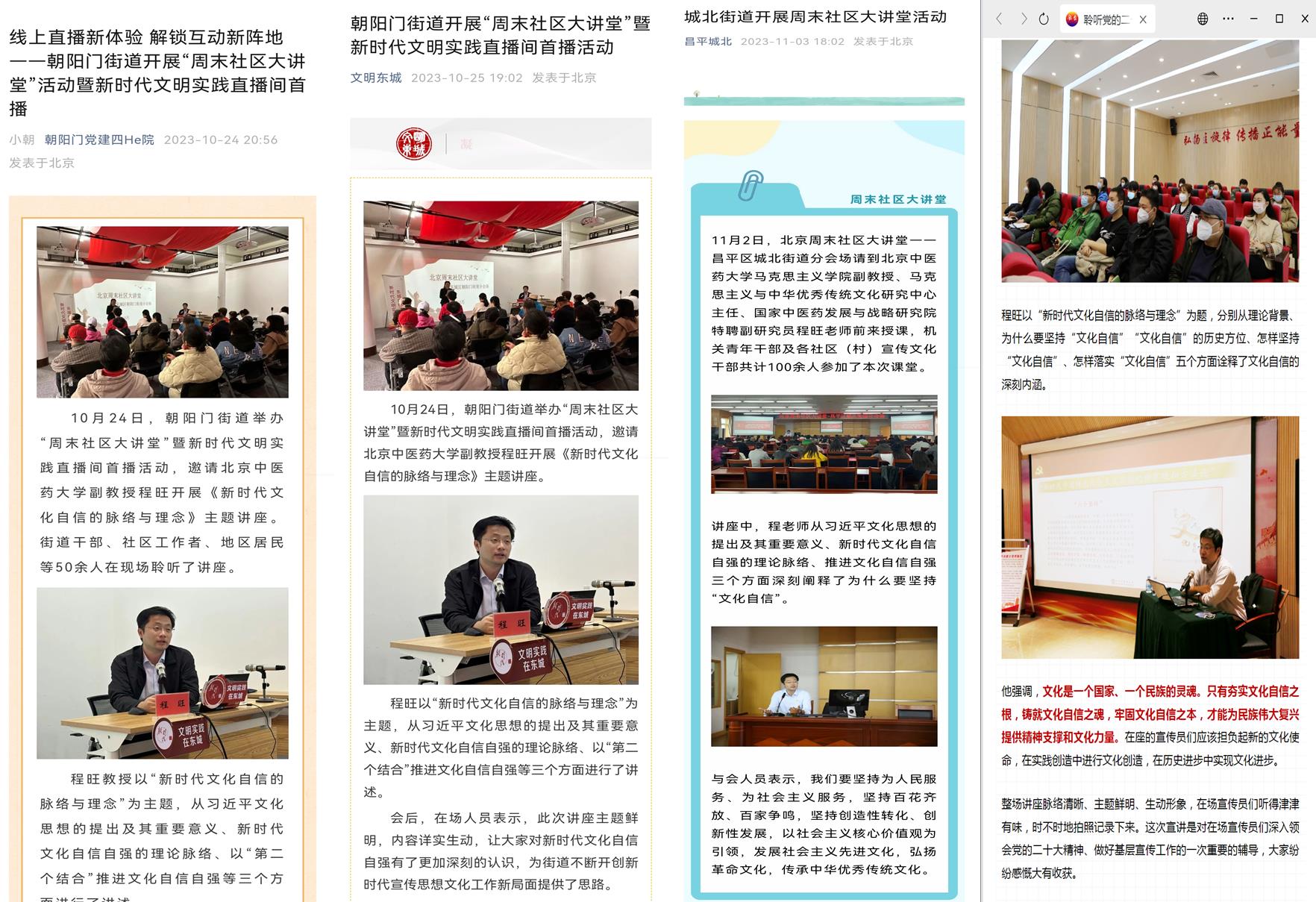 近期,ok138cn太阳集团程旺老师应北京周末社区大讲堂邀请,先后赴东城区朝阳门街道、怀柔区怀柔镇政府、昌平区城北街道开展理论讲座活动。这是程旺老师此前多次深入西城、通州、大兴等基层讲座后,再次为北京周末社区大讲堂进行讲座。